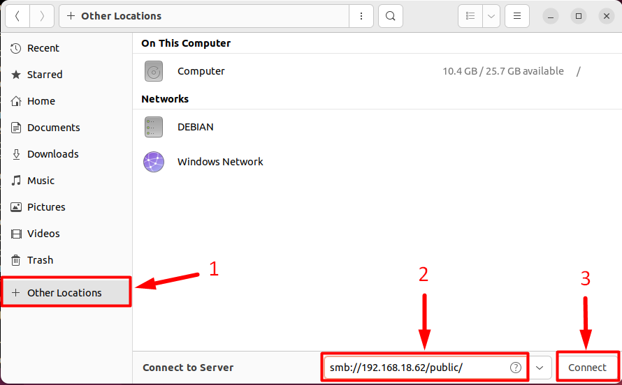 The “Other Locations” allows the users to access the “samba” share on the server. To access it, open the “Files” or other default file manager and at the bottom find the “Connect to Server” option. Use the following format to connect with a remote “samba” server: