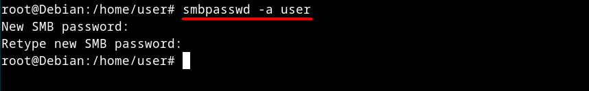 To enable secure remote access, users must set a password for the share. To set a password for the “samba” server share, run the following command and switch to the “root” user: