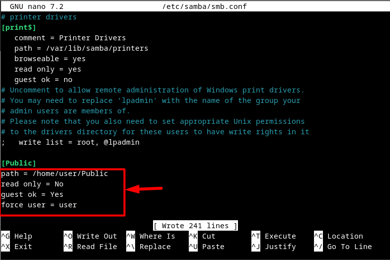 - The “force user = user” property specifies the user that can access the share with all permissions. Use this option if a specific user is unable to connect with the share, otherwise the “guest ok = Yes” does the work.