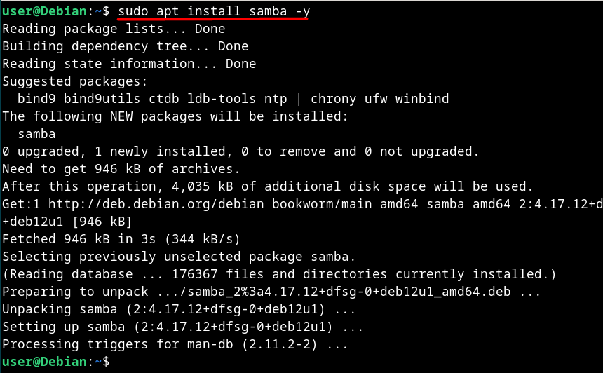 The “samba” server is officially available for most Linux distributions including Debian 12. To install it, use the following command: