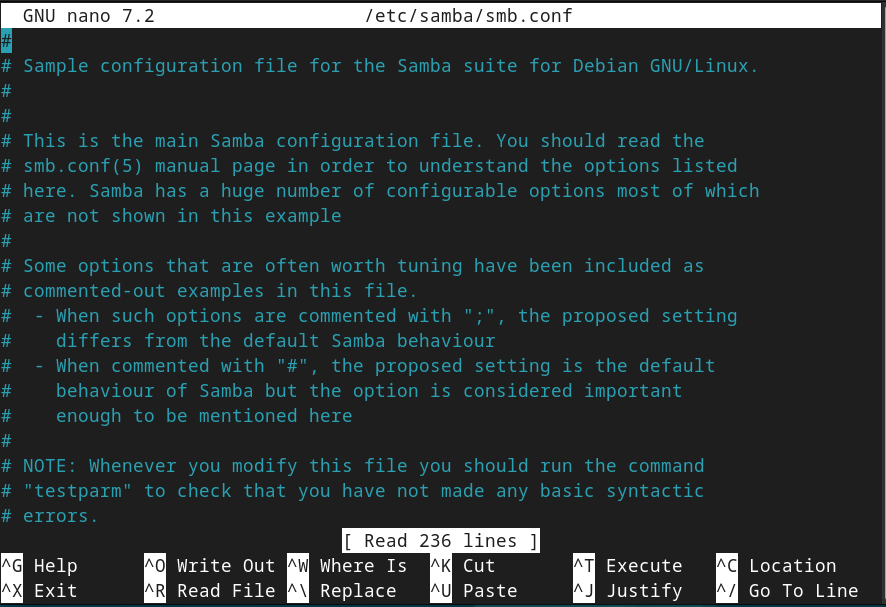 To configure the “samba” server, users must use the “/etc/samba/smb.conf” file. To open it using the nano editor, run: