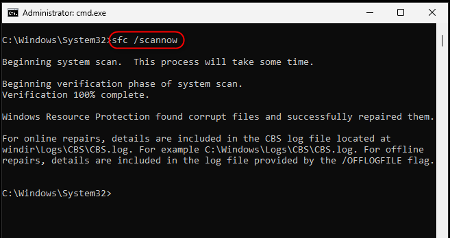 Run the following command in the Windows PowerShell or Command Prompt to trigger the “SFC Scan” to find and fix the corrupt system files: