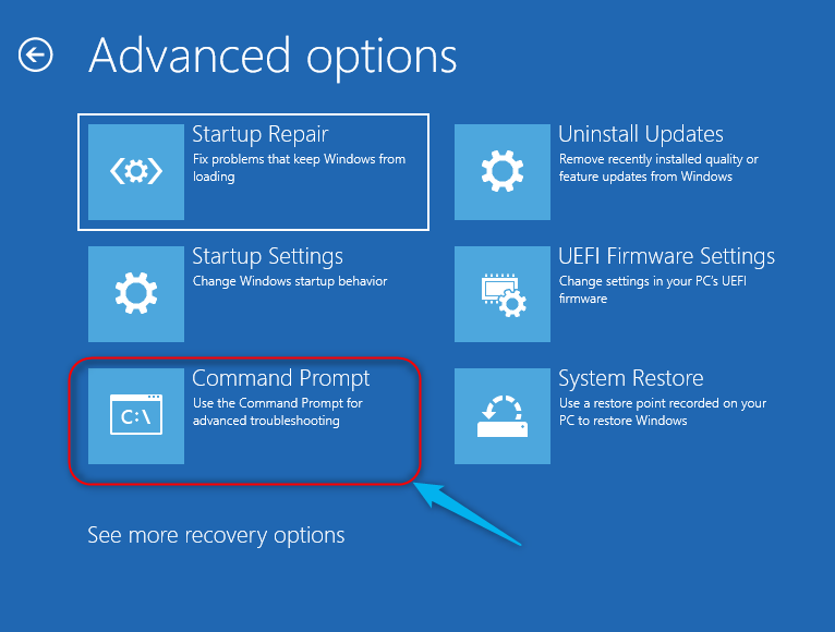 Step 2: Navigate to Troubleshoot ? Advanced Options and then select the Command Prompt: