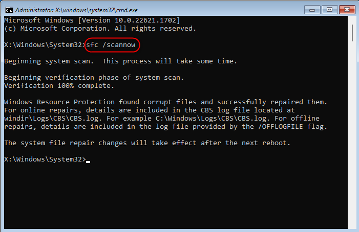 After booting into “Enable Safe Mode with Command Prompt” via the Windows Recovery Environment, the Command Prompt opens automatically. Now run the “SFC Scan in Safe Mode” using the following command: